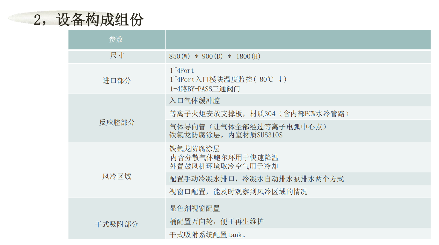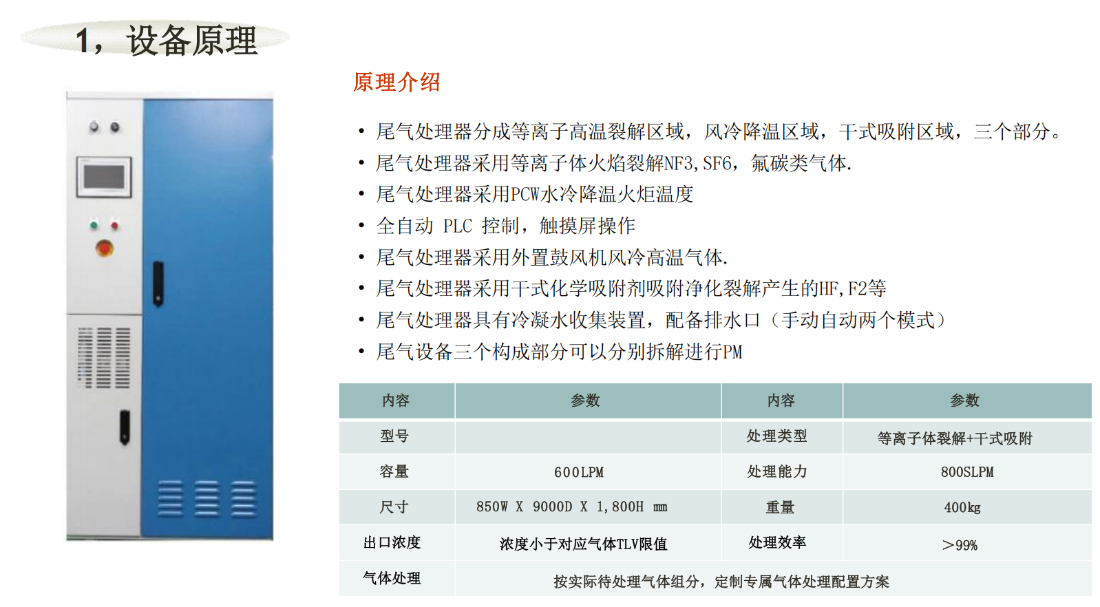 通过加热模块,配备温度高及温度低报警功能,并配以充足空气(空气需用户现场提供)助燃,含尾气处理器稀释助燃气体用量,尾气可处理容量≥1500升每分钟,将可燃或可分解废气燃烧、氧化、分解,达到降害目的,本设备可处理可燃性/爆炸性气体处理量≥220SLM,如如氢气、乙炔、磷烷、一氧化碳、二氟甲烷、氟化甲基等,DIMENSION 尺寸 约1000*900*2060(W*D*H)
